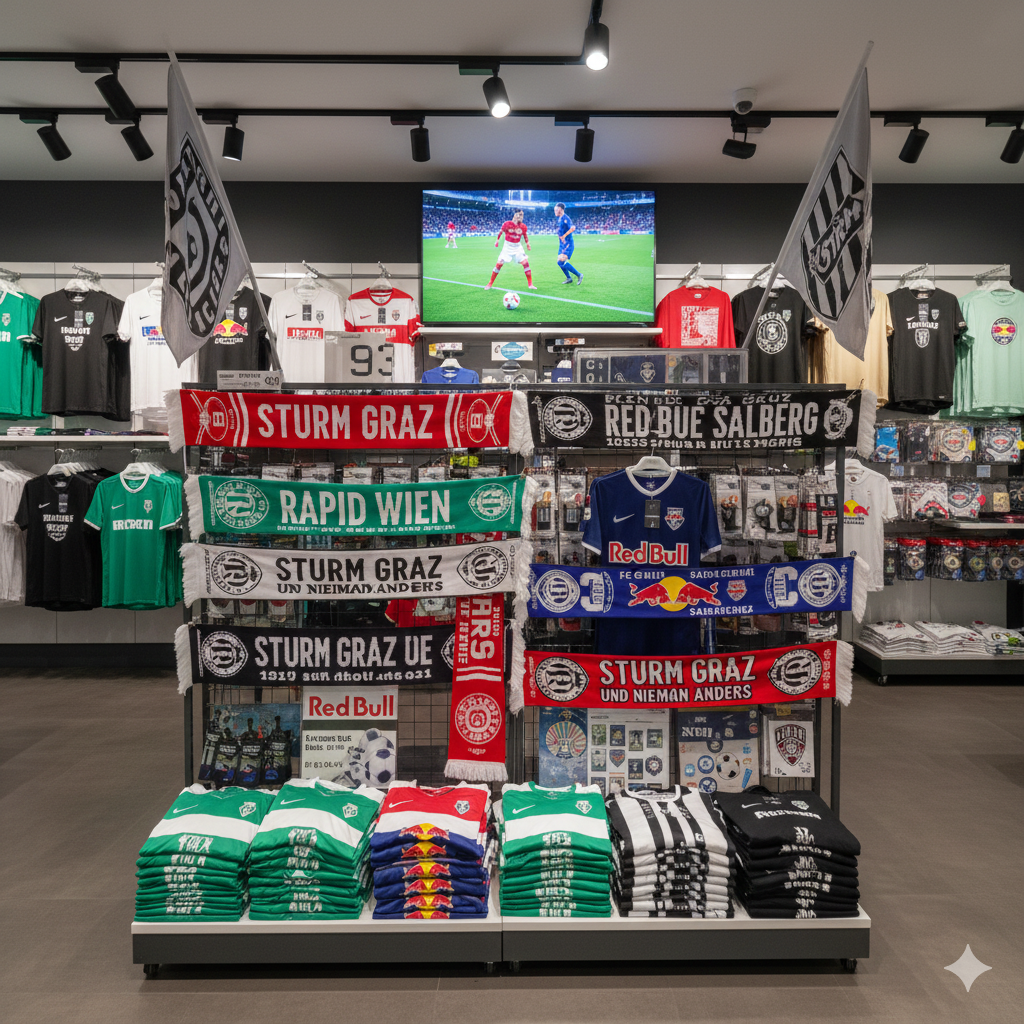 „sichtbare Leidenschaft und wichtige Einnahmequelle“, erstellt von Google Gemini 3 Pro am 2.Dezember 2025 um 14:59, mit dem Prompt: „bitte generiere mir ein Bild von Fanartikeln, Merchandising, Trikots, Schals, Fahnen, Kleidung und Souvenirs. Mit Fokus auf echte Österreichische Vereine wie Rapid Wien, Salzburg, Sturm Graz.“