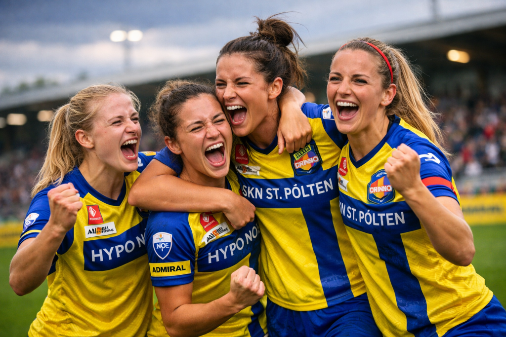 Emotionen auf dem Platz des Frauenteams vom SKN St.Pölten, erstellt von ChatGPT-5.2 am 17.12.2025 um 15:19, mit dem Prompt: „erstelle uns ein Bild von dem SKN St.Pölten Damen Fußball mit Emotionen“.
