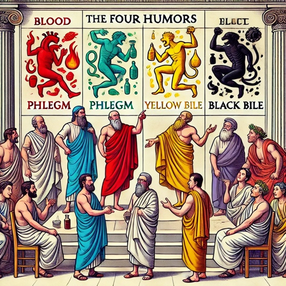 ChatGPT 4O; Prompt: “ Generiere mir ein Bild, das Humor der alten Griechen darstellt. Sie haben Humor als Ausdruck der vier Säfte (Blut, Schleim, gelbe Galle und schwarze Galle) verstanden.“; 21. August 2024, 17:42 Uhr